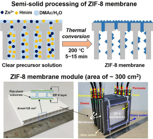 该研究提出了一种简单高效的半干态合成工艺,实现了ZIF-8分子筛膜超快速(低至5分钟)、高产量(料液全利用)、高重复性合成。制备的ZIF-8膜的丙烯/丙烷分离选择性高达190,并在高温、高压下依旧保持优异的分离性能,同时可实现实际工业气体的长时间高效分离。更重要的是,采用半干态合成工艺在未经任何修饰的商业化板式陶瓷载体上成功制备ZIF-8膜,并通过串联方式实现了ZIF-8膜的组件化装填(组件有效膜面积大于300 cm2)。ZIF-8膜组件与单个ZIF-8膜的丙烯/丙烷分离选择性均超过35且差异较小,证实半干态合成工艺具有优异的ZIF-8膜规模化制备潜力。该工作为进一步推动ZIF-8膜在实际工业分离中的应用奠定了基础。