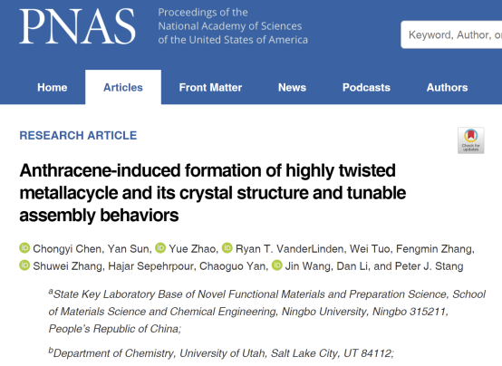 为第一单位的题为“Anthracene-induced Formation of Highly Twisted Metallacycle and Its Crystal Structure and Tunable Assembly Behaviors”的研究论文。该论文的合作者为美国犹他大学的Peter Stang院士。