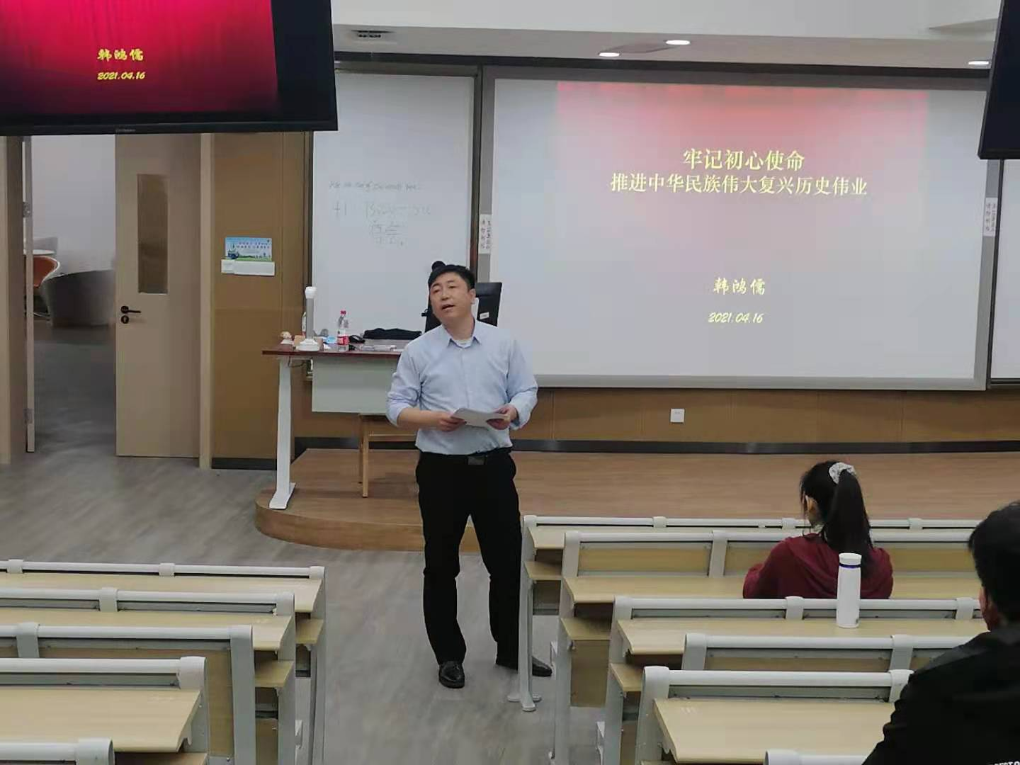 韩鸿儒老师在课上强调,当今世界正经历百年未有之大变局,我国正处于实现中华民族伟大复兴关键时期,我们应该牢记初心使命,推进中国民族伟大复兴历史伟业。