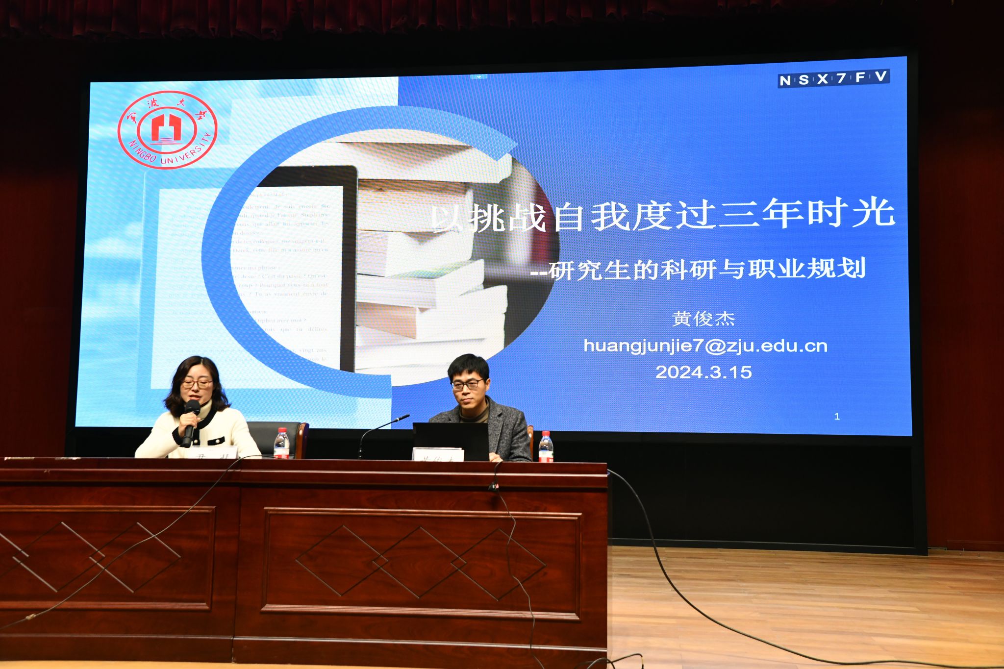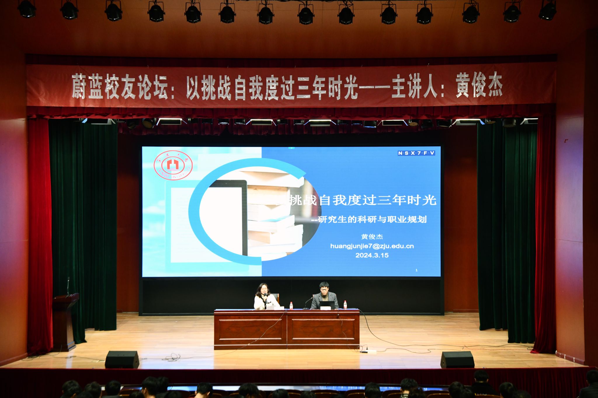 在忻元甫报告厅举办蔚蓝校友论坛第一讲,2019级优秀校友黄俊杰应邀返校,以“以挑战自我度过三年时光”为主题为学院400余名2023级材料专业研究生上了一堂生动有趣的人文素养课。