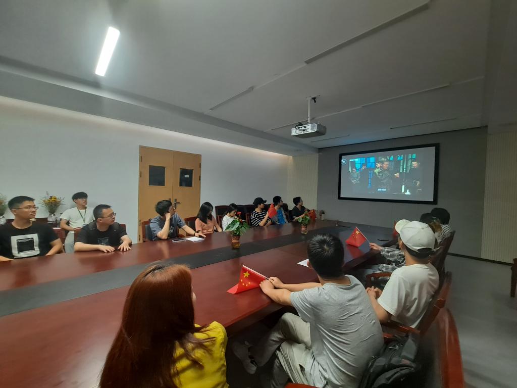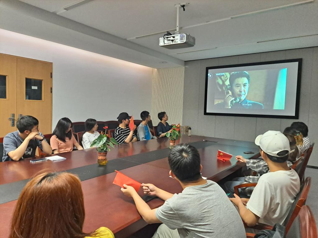 下午2:30,影片正式开始播放,学院组织部分学生在227会议室集中观看,要求其他学生在实验室、办公室和寝室等地点分散观看,每看到激动人心的镜头,同学们手举国旗不断挥舞,在班级、年级群里纷纷发言,“弹幕”漫天。