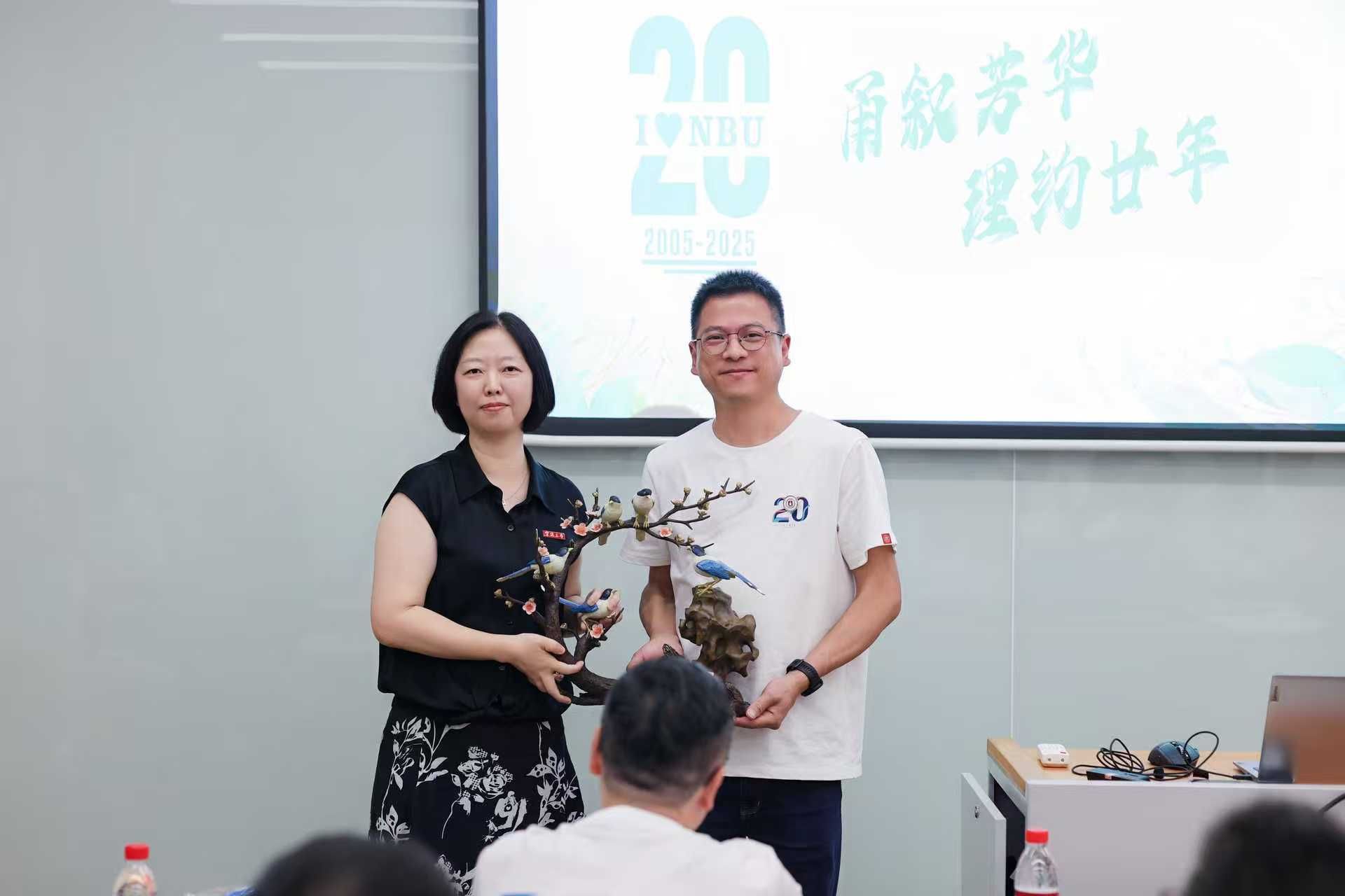 参观结束后,校友们齐聚逸夫材化楼北楼1225会议室,举行了一场温馨而又别开生面的班会。会上,材化学院党委书记陶娟对校友们回家表示热烈的欢迎,对大家一直以来关心支持母院表示衷心感谢,并介绍了学校及学院二十年来的发展成就。(图6)庄惠强校友代表化学专业2005届全体同学向学院赠送了饱含校友情谊的雕塑,蕴含着学院人才培养工作喜讯频传的美好愿望。