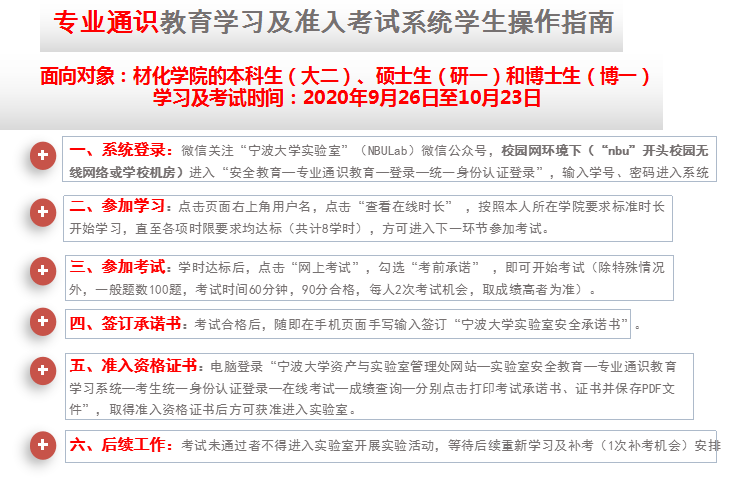 实验室管理专项目标考核的要求,每一位需要进入实验室学习和工作的师生必须进行实验室安全的在线学习、考试,成绩合格方可进入实验室工作学习(准入制),考核未合格的学生严禁进入实验室,其名单将在欲漫涩