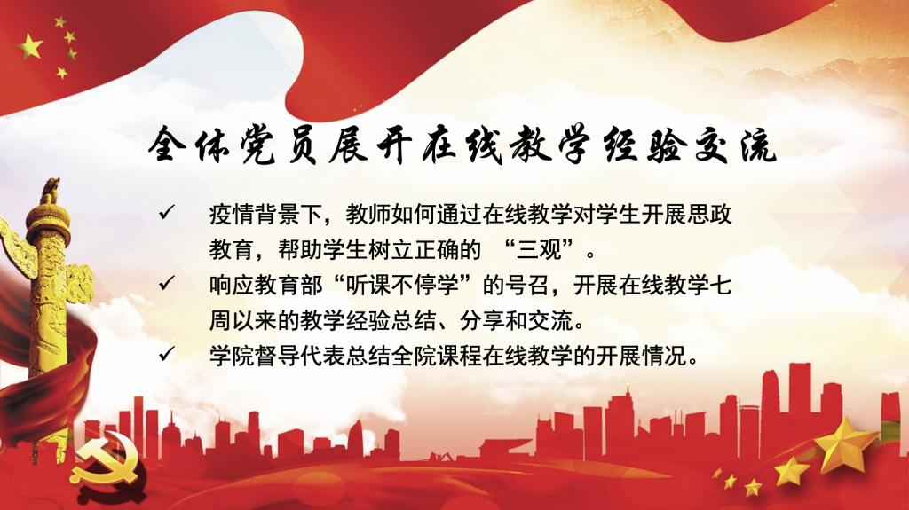 化学党支部依托钉钉云视频会议开展主题为“抗击疫情悟初心 在线教学担使命”的主题党日活动。学院相关负责人、学院教学督导和师生党员等30余人参加。