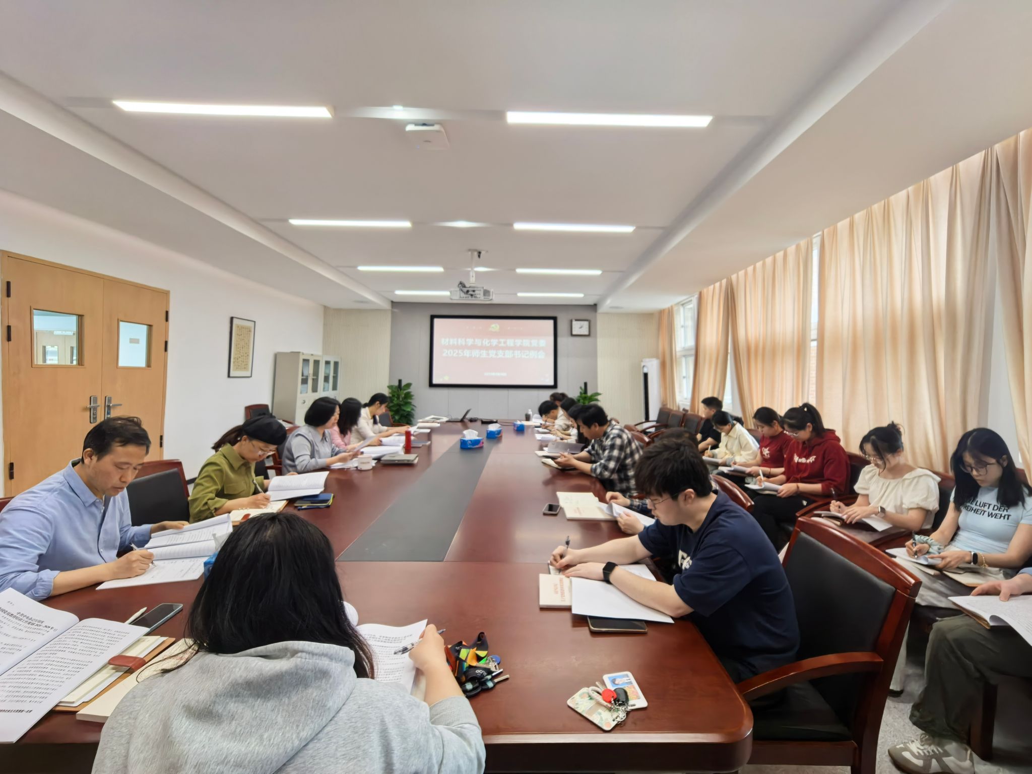 3月26日下午,我院在逸夫材化楼北楼227会议室召开了2025 年全体师生党支部书记工作例会。学院党委书记陶娟、副书记尹慧、党委委员、全体师生党支部书记、副书记、专职组织员、学生党建辅导员等参加了此次会议。会议由党委书记陶娟主持。