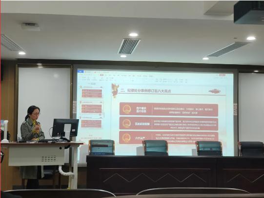 纪委书记朱燕给学院预备党员作题为《学史明理:学纪律处分条例 明党员责任担当》的党课,通过学习条例守纪律,推进全面从严治党。