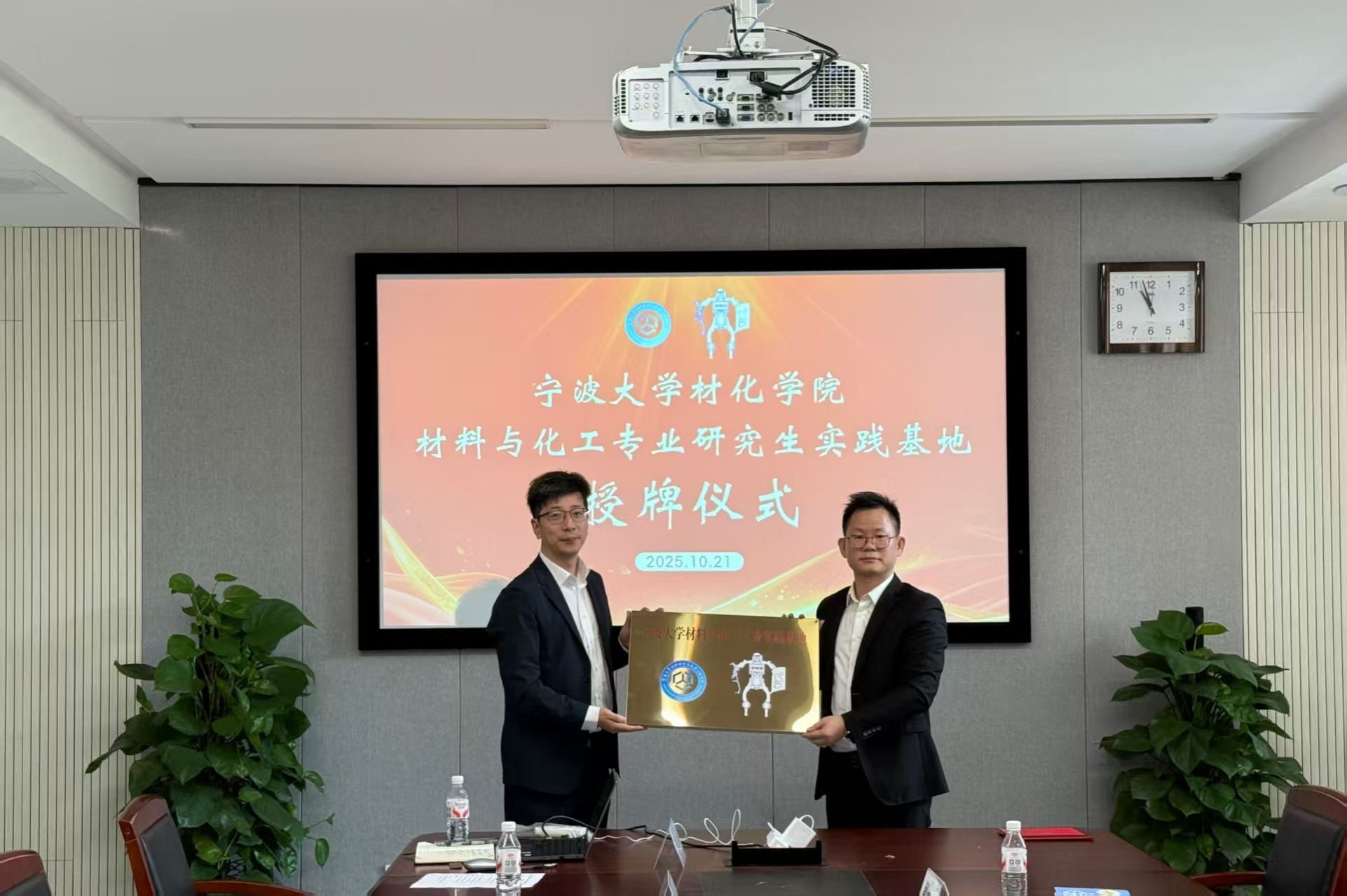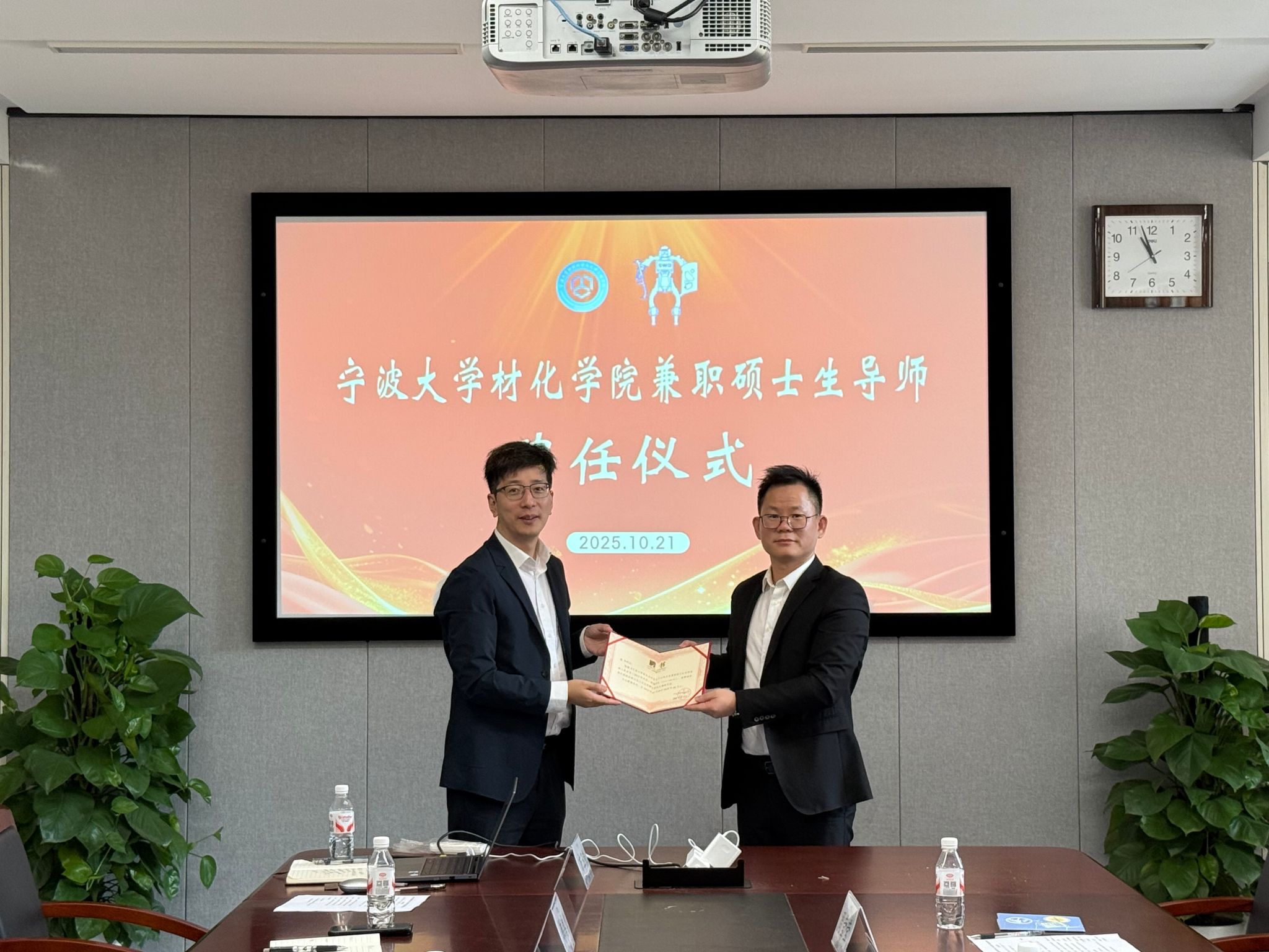 交流结束后,进入授牌与聘任环节。周明炯代表学院,向赛维达公司授予“材料与化学工程学院-赛维达材料与化工专业实践基地”铜牌,并向冯平颁发兼职硕士生导师聘书。