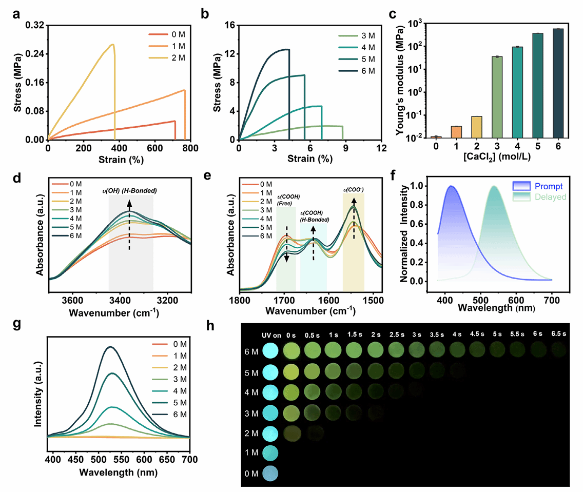 课题组构建了PAA/DETA-Ca2+室温磷光水凝胶体系,核心是利用Ca2+与PAA链上羧基的离子配位作用:以DETA 为交联剂聚合AA形成PAA网络,浸入CaCl2溶液后,Ca2+使水凝胶网络致密化,既限制聚合物链段运动、减少水分子对磷光发光中心的猝灭,又提升ISC过程效率、增强杂原子基团聚集效应,最终实现持久磷光,在6M Ca2+浓度下,磷光余辉达6.5s,寿命从低浓度166.8 ms延长至396.6 ms。