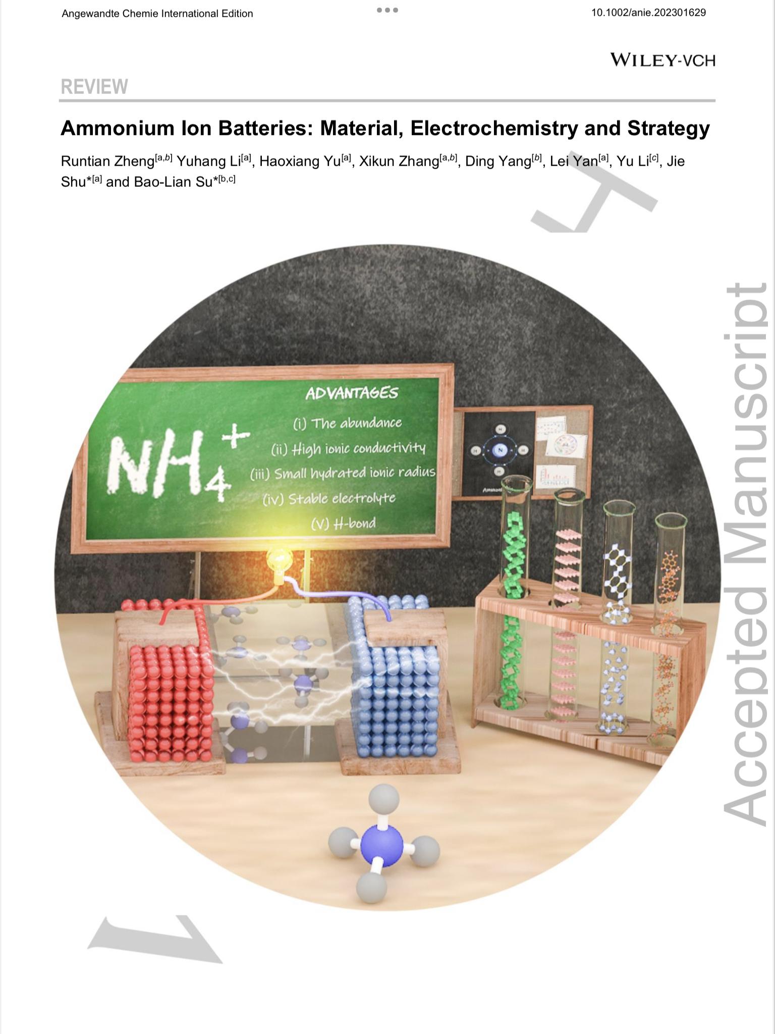 近日,欲漫涩 能源化学团队在新型电池领域取得了重要进展,该团队针对水系铵离子电池中的关键科学和技术问题进行了梳理分析,重点阐述了铵离子电池的结构设计、电极材料的选用及电解液的匹配优化问题,相关结果发表在国际顶级期刊德国应用化学Angewandte Chemie International Edition上,欲漫涩 是论文的第一署名单位,硕士生郑润田为第一作者,舒杰教授为通讯作者。