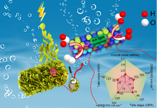 为了开发一种可同时作为电催化全解水正负极的催化剂材料,课题组深入研究了Mn掺杂对其HER和OER性能的影响。所设计的Mn-NiCoP催化剂用于全解水时,在1.69 V的低电池电压下可提供100 mA cm-2的电流密度,使其成为最高效的全解水催化剂之一。重要的是,该工作的实验和计算结果有力地证明了适量的Mn可以在不影响其HER性能的前提下大幅提高NiCoP的OER性能。这为设计双功能电解水催化剂材料提供了参考,如图1所示。此外,课题组通过电沉积法在CoFe-LDH@NiCoP/NF电极中均匀地构建了n-n型异质结,这不仅增强了催化剂的导电性和动力学性能,还提高了催化剂的电化学稳定性。如图2所示。因此,在全解水体系中,CoFe-LDH@NiCoP/NF同时作为阴极和阳极只需要1.735 V电压就能达到200 mA cm-2的电流密度,这为调节电催化剂的电子结构提供了更多可能性。