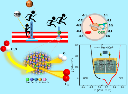 图1. 适量Mn掺杂提升NiCoP的OER性能使其课作为双功能全解水电催化剂。