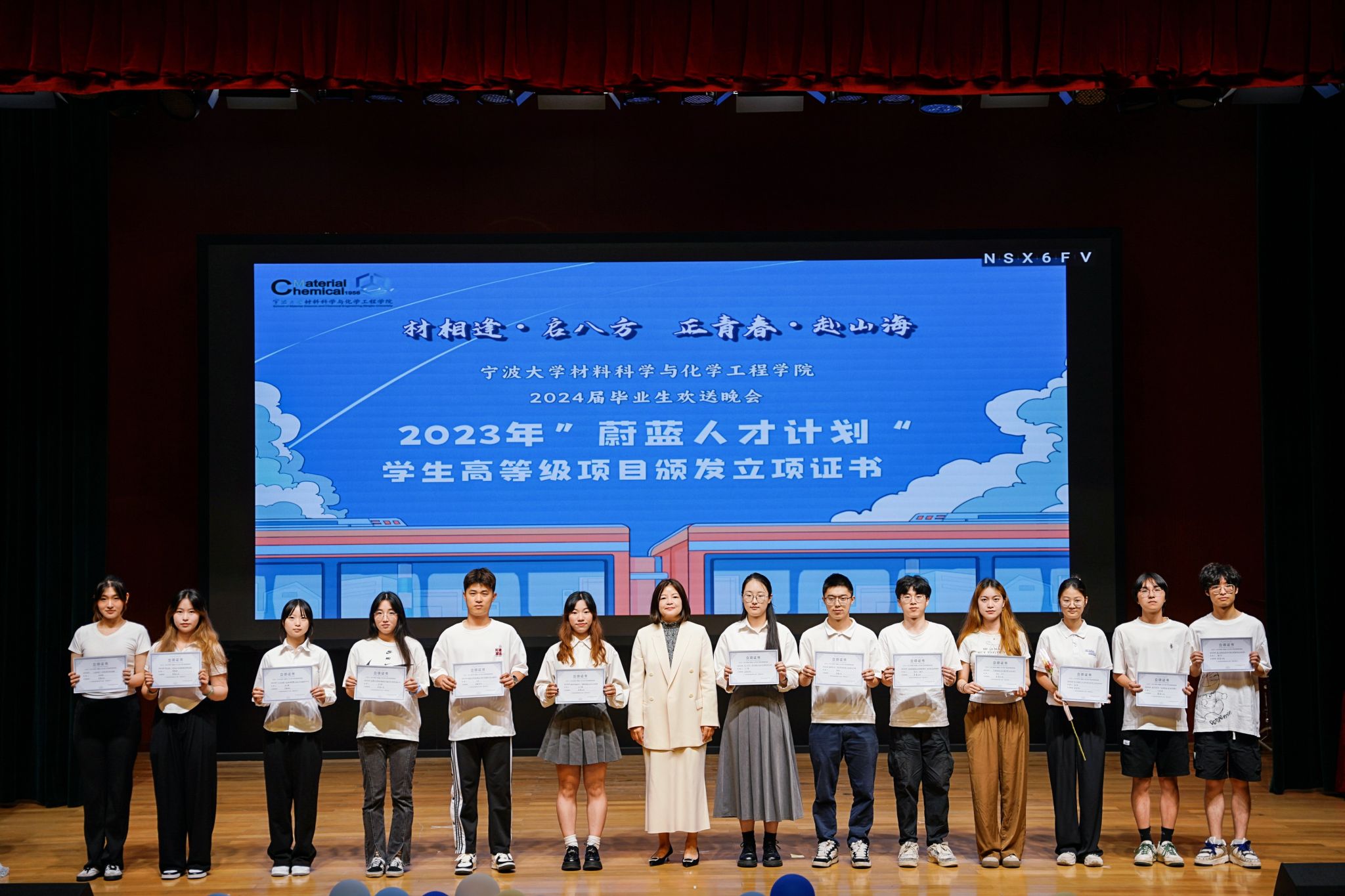 晚会现场,陈燕燕女士颁发“蔚蓝人才计划”项目立项证书。该项目由晶科能源赞助院企合作、深化发展,体现了社会对教育事业的关怀以及学院对学生创新创业能力培养的高度重视。学院领导为欲漫涩 校级优秀毕业生、省级优秀毕业生颁发荣誉证书、为校友联络员颁发聘书,激励更多材化学子用努力和奋斗,书写自己的青春华章,希望材化学子们不忘母校栽培,继续关心母校发展。