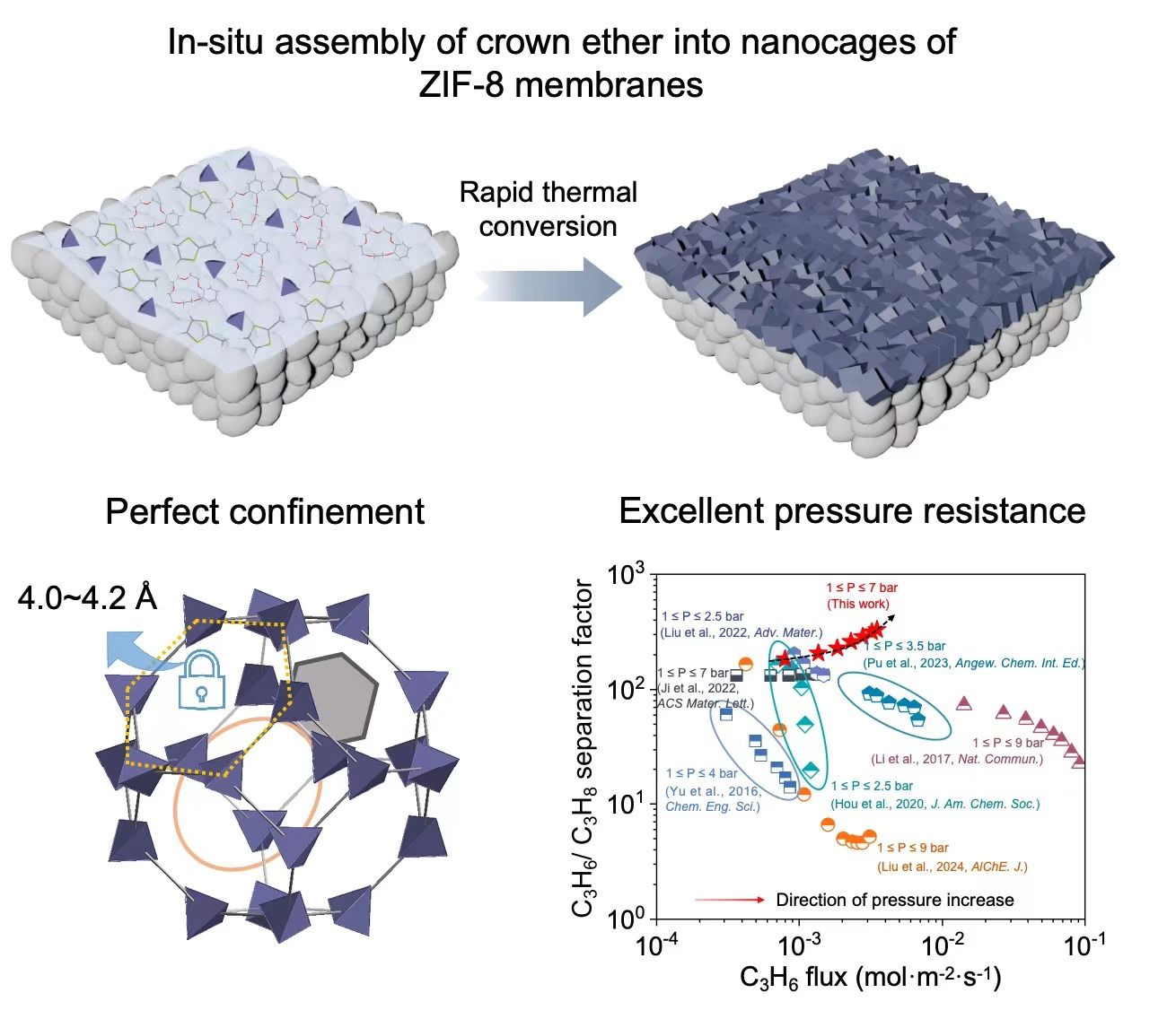 ZIF-8材料具有优异的丙烯/丙烷动力学筛分性能,因而被认为是一种理想的丙烯/丙烷分离膜材料。然而,ZIF-8材料存在压力、温度和客体分子等外界因素诱导产生的框架柔性变形,在严苛的工业分离条件下,ZIF-8膜长期服役过程中微观结构的变化会严重降低其分离效率。对此,在前期研究基础上(Angew. Chem. Int. Ed., 2020, 132, 22093-22098),李砚硕教授团队提出以分子化合物冠醚作为“Cavity occupant”,利用冠醚分子的空间尺寸效应抑制ZIF-8框架中配体的自由转动,实现其孔道从“柔性”至“刚性”的转变。研究结果证实,经冠醚分子修饰后的ZIF-8膜对丙烯/丙烷的选择性从103提升至220。与柔性ZIF-8膜不同的是,经冠醚分子修饰后的ZIF-8膜的丙烯/丙烷分离选择性随着操作压力的升高而显著提升,在7 bar的压力下,丙烯/丙烷分离选择性高达331,远高于目前报道的最优分离性能,并在连续高压测试条件下保持了优异的分离稳定性。这一突破性研究结果将为发展ZIF-8膜用于丙烯/丙烷的工业分离提供了研究基础。