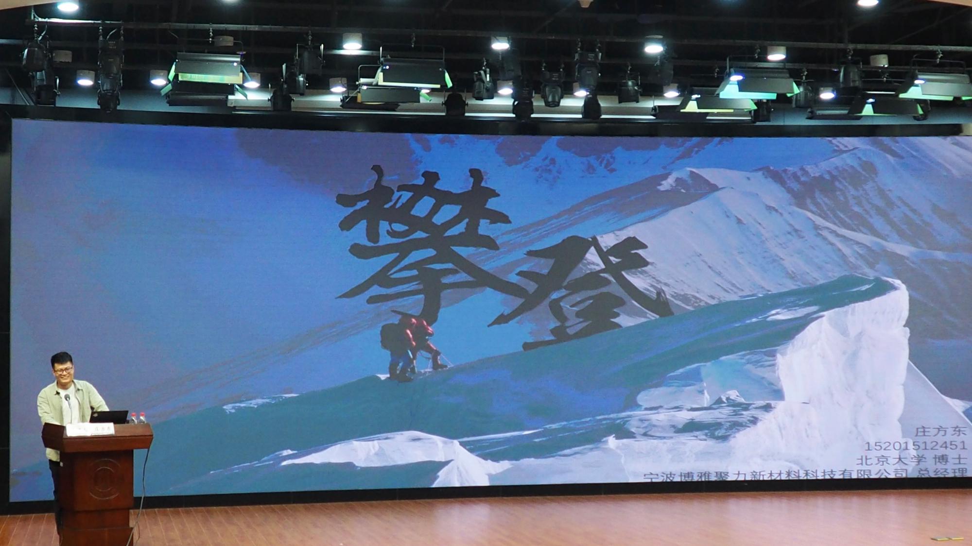 邀请宁波博雅聚力新材料科技有限公司总经理庄方东在真诚图书馆为2022届毕业生做题为“攀登”的最后一堂思政课。院党委书记罗云杰、副书记朱燕、辅导员参加,讲座由朱燕主持。