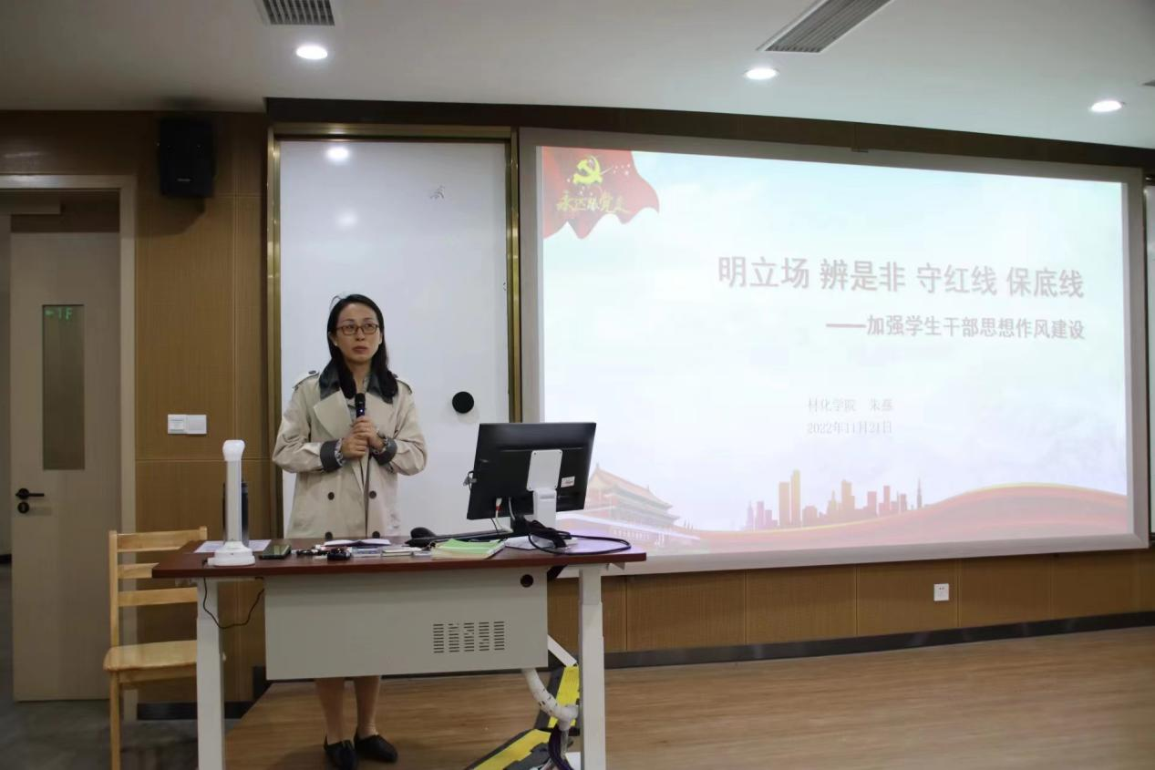 首先,朱燕分析了当下学生干部可能会存在的作风问题,同时指出加强学生干部的思想作风建议的意义,然后就如何加强学生干部思想作风建设问题提出三个要求:一是要加强思想觉悟,思想是行动的先导,立场决定观点,观点指导行动。在社会、学校、学院发展的过程中,会遇到很多问题,学生干部要带头从师生利益的同一性出发看待问题,体现核心意识和大局意识。二是要加强明辨是非能力,她分别从国际维度、国家维度和个人维度入手,以案例向大家展示当下意识形态阵地存在的安全隐患,学生干部要带头守住思想阵地,体现政治意识。三是要有严格的纪律意识,学生干部牢记自己的首要身份是学生,当树立为学生群体服务的意识,坚决反对“官”本位思想和作风,希望学生干部成为活动的“幕后”主手,老师的得力助手,各类竞赛的小能手。
