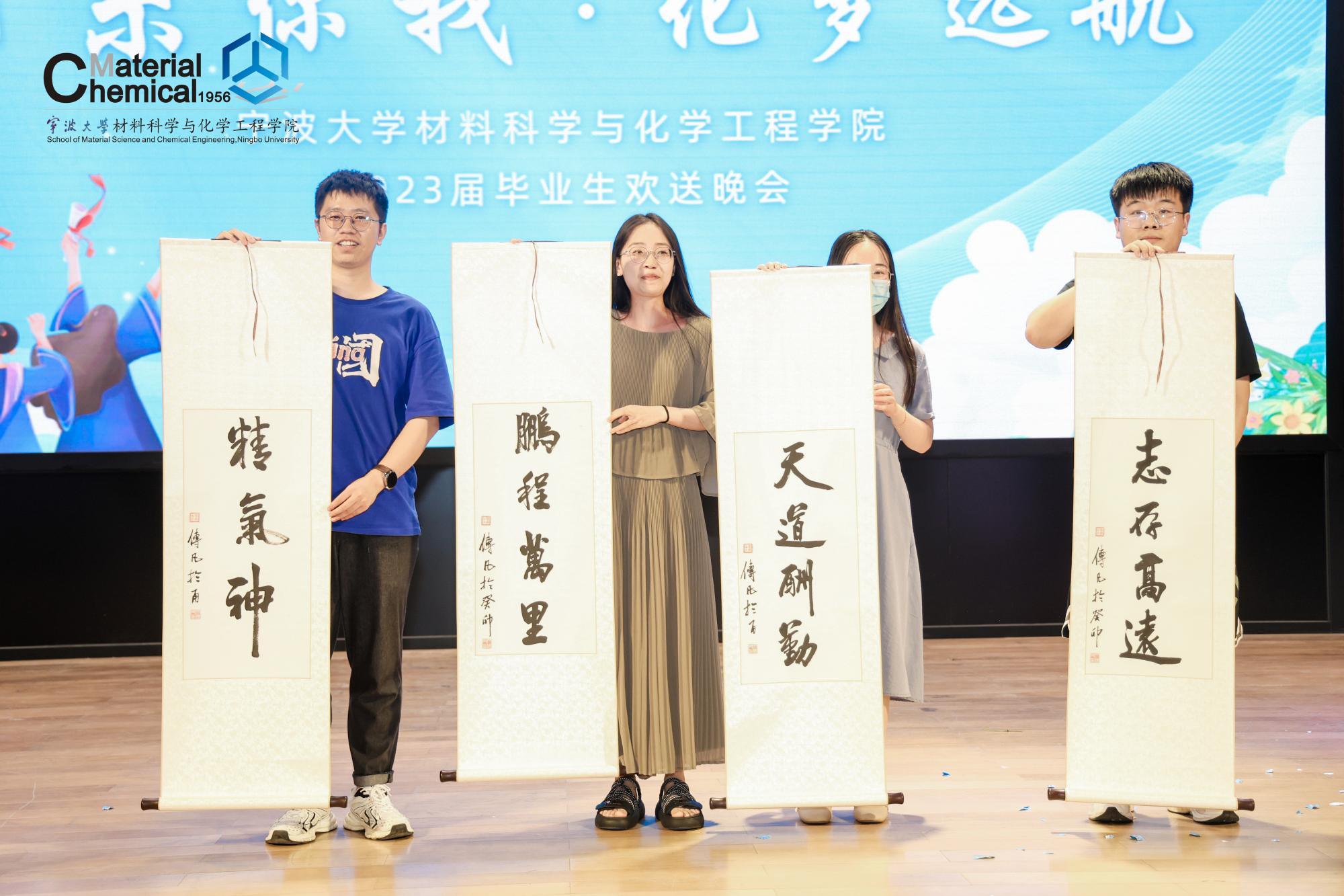 欢送晚会的表演以“热烈、青春、深情”为主要基调,分为《芳华•稼穑》《芳华•绽放》《芳华•循梦》《芳华•惊鸿》四个篇章,节目既有饱含情感的歌曲演唱,也有活泼灵动的舞蹈,同时,还有颇具专业特色的原创配音剧、致敬经典的情景剧以及追忆校园生活的幕布剧等,别出心裁的表演形式带给了全场师生一场美轮美奂的视听盛宴,缅怀青葱校园岁月,感恩师长教导。在晚会的尾声,丁传凡现场赠送给毕业生代表们“志存高远”“天道酬勤”“鹏程万里”“精气神”四幅亲手写就的墨宝,鼓励毕业生们既要仰望星空又要脚踏实地,在奋发向上中展中国青年风采。