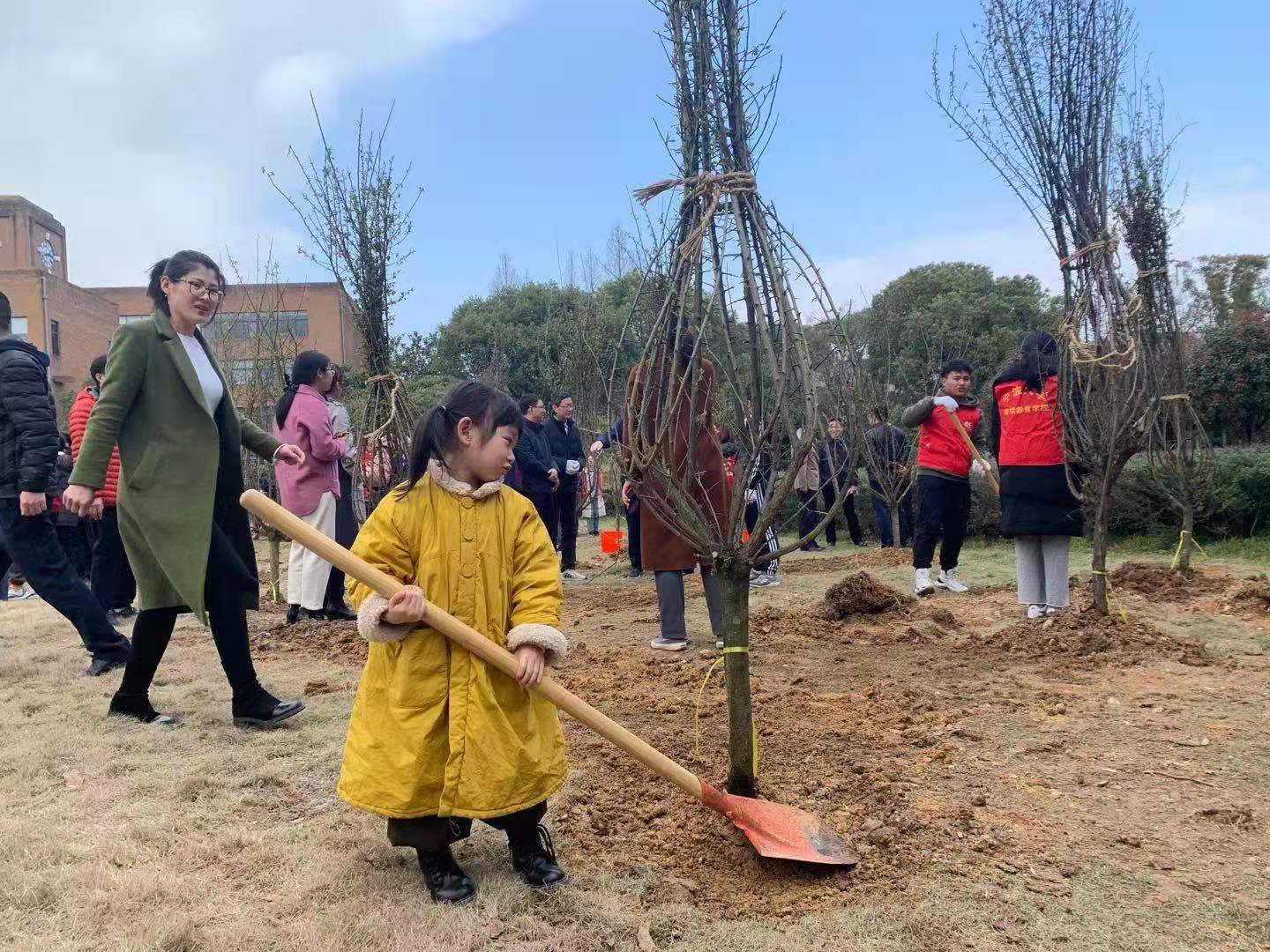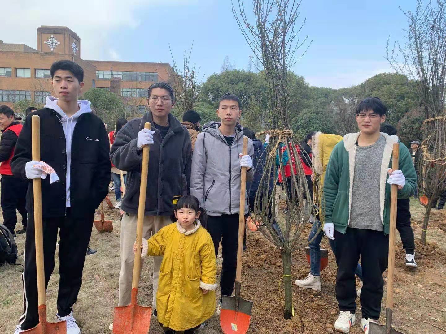 的师生代表包括教职工子女代表来到包玉刚图书馆东侧绿地,拿着后勤管理处为今年的义务植树活动准备的梅花树苗及植树工具开始了植树。