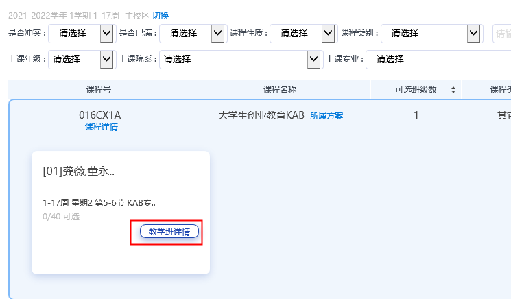 8. “全校课程查询”:学生可在该查询类别中查询学期开设的所有课程的详情。每门课程名称点进去后,可以查看该门课程的限制信息和选课说明,请同学务必查看,否则可能导致误选。