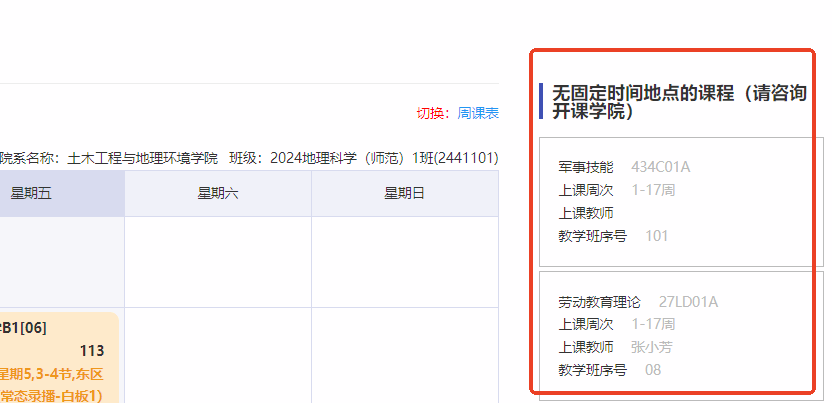 请同学务必登录网上办事大厅中的“我的课表”APP应用进行选课情况的检查。没有安排时间、教室地点的课程会出现在同学课表的最右边(如下图所示),也是同学已经选课的课程,此类课程具体上课时间、地点不在系统中体现,请选了此类课程的同学务必要联系该课程所在学院的任课老师,明确具体的时间和地点。
