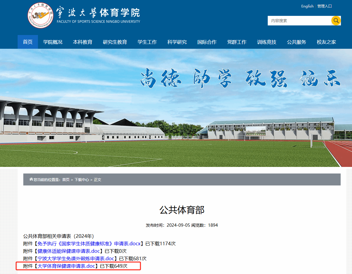 下载并填写《大学体育保健课申请表》(下载流程见下图),附上诊断书和证明资料,先交原体育课任课老师签字(若未选大学体育课则无须签字),后至本部田径场司令台下方A101室找陈奂老师审核并签表,最后再到体育学院教务办107找徐巧英老师选大学体育保健课。上课时须将《大学体育保健课申请表》、诊断书和证明资料交给保健班任课老师。